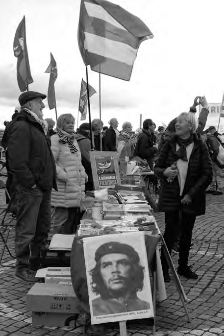 Bei der Abschlusskundgebung auf dem Burgplatz war die Regionalgruppe Düsseldorf der Freundschaftsgesellschaft BRDKuba e.V. mit einem Infostand vertreten. Damit wurde auch die Kampagne 2024 „#Unblock Cuba – Wirtschaftskrieg gegen Kuba beenden“ in Düsseldorf gestartet. Am Infotisch war auch EcoMujer e.V., Frauen und Umwelt vertreten. Und die Freundinnen der Gruppe Free Julian Assange kamen auch vorbei.