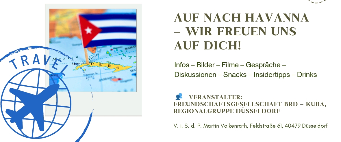 Bei den Gesprächen an den Infoständen auf den Veranstaltungen der Regionalgruppe Düsseldorf wurden oft Fragen zu Reisen nach Kuba gestellt, die meistens von uns nicht kompetent beantwortet werden konnten. Wir hatten daher beschlossen, eine Veranstaltung zu Reisen nach Kuba durchzuführen, um damit dem vorhandenen Informationsbedarf entgegenzukommen und damit den Tourismus nach Kuba zu unterstützen.