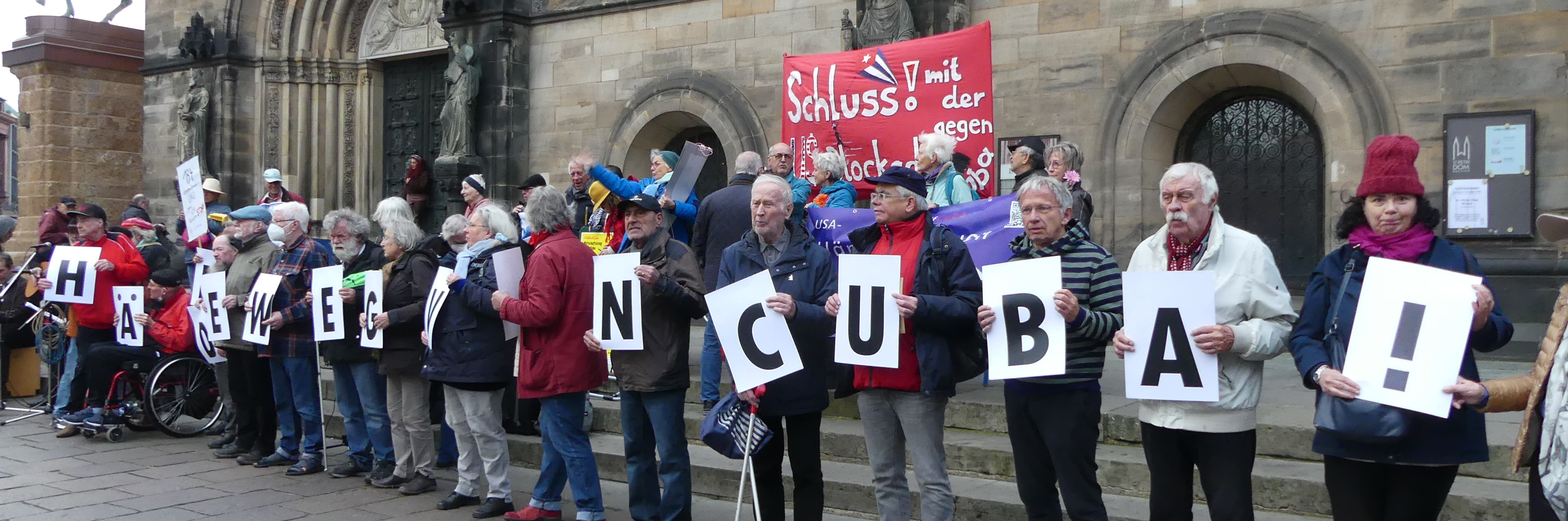 Auch in Deutschland forderte die Solidaritätsbewegung ein Ende der völkerrechtswidrigen US-Blockade. Der Schauspieler Rolf Becker sprach bei der Aktion in Hamburg.