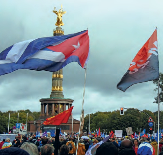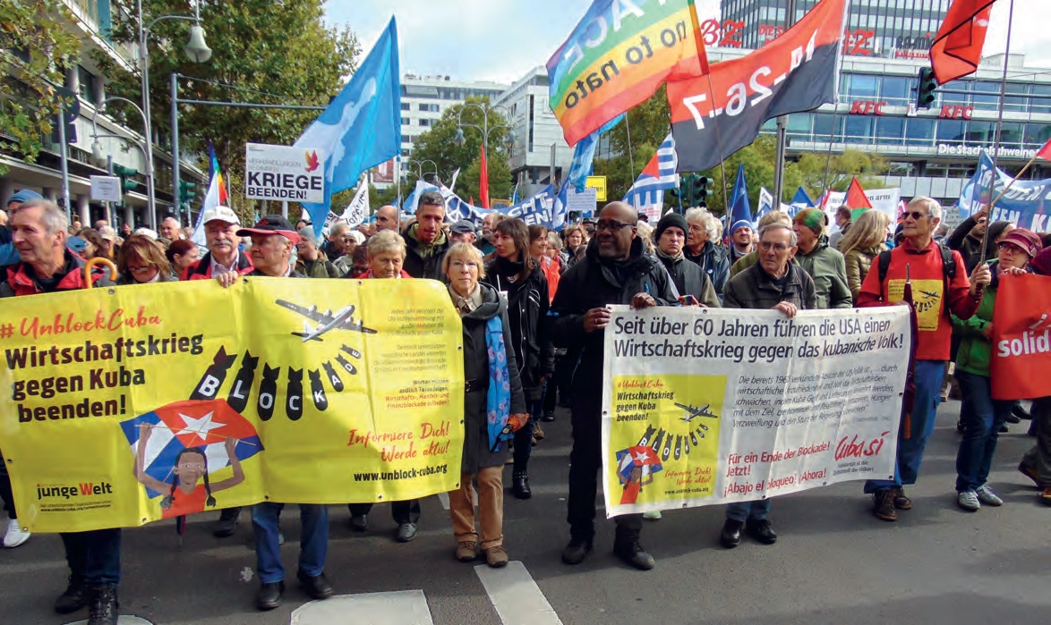 Am 3. Oktober demonstrierten Zehntausende in Berlin gegen Rüstungswahnsinn, Kriegstreiberei und die Stationierung von US-Mittelstreckenraketen in der Bundesrepublik. Kuba hat seit der Revolution immer wieder in Friedensprozessen eine wichtige Rolle gespielt und ist selbst aber seit über 60 Jahren Opfer eines Wirtschaftskrieges von Seiten der USA. So wundert es nicht, dass Kuba-Aktivisten Teil der Demo waren und zur Beendigung der Blockade gegen Kuba aufriefen.