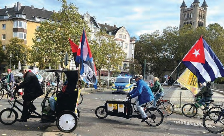 Die Fahrraddemo am 26.10.24 war dann der Abschluss unserer Aktivitäten in diesem Jahr gemeinsam mit den Freundinnen von EcoMujer e. V. Das Motto war klar: „Unblock Cuba – Steig aufs Rad und in die Rikscha für das Ende der US Wirtschaftsblockade gegen Kuba! Kuba muss sofort von der US-Terrorliste gestrichen werden!“ Und so trafen sich etliche Kubafreunde und Kubafreundinnen, compañeros und compañeras am Hauptbahnhof Düsseldorf vis-á-vis zum US-Konsulat zur Eröffnungskundgebung. Dann startete die Fahrraddemo bei bestem Wetter. Es wurden drei Zwischenkundgebungen abgehalten, bei denen über die nächste UN-Sitzung, für die Forderung nach Beendigung der US-Blockade und die Streichung Kubas von der Terrorliste informiert wurde. Der Abschluss fand dann am Rhein statt mit einem lockeren get together der Teilnehmenden: Die Verbundenheit untereinander in der solidarischen Unterstützung Kubas konnte noch weiter gefestigt werden. |