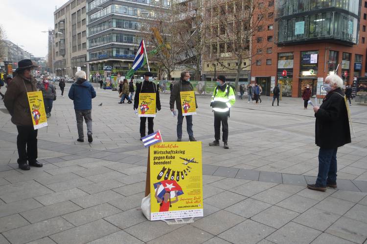 Die Freundschaftsgesellschaft BRD-Kuba, Regionalgruppe Bonn informierte mit CUBA Fahnen, Infomaterial und lauter kubanischer Musik geben, um die kriminelle US Wirtschafts-, Handels- und Finanzblockade gegen CUBA aufzuheben.