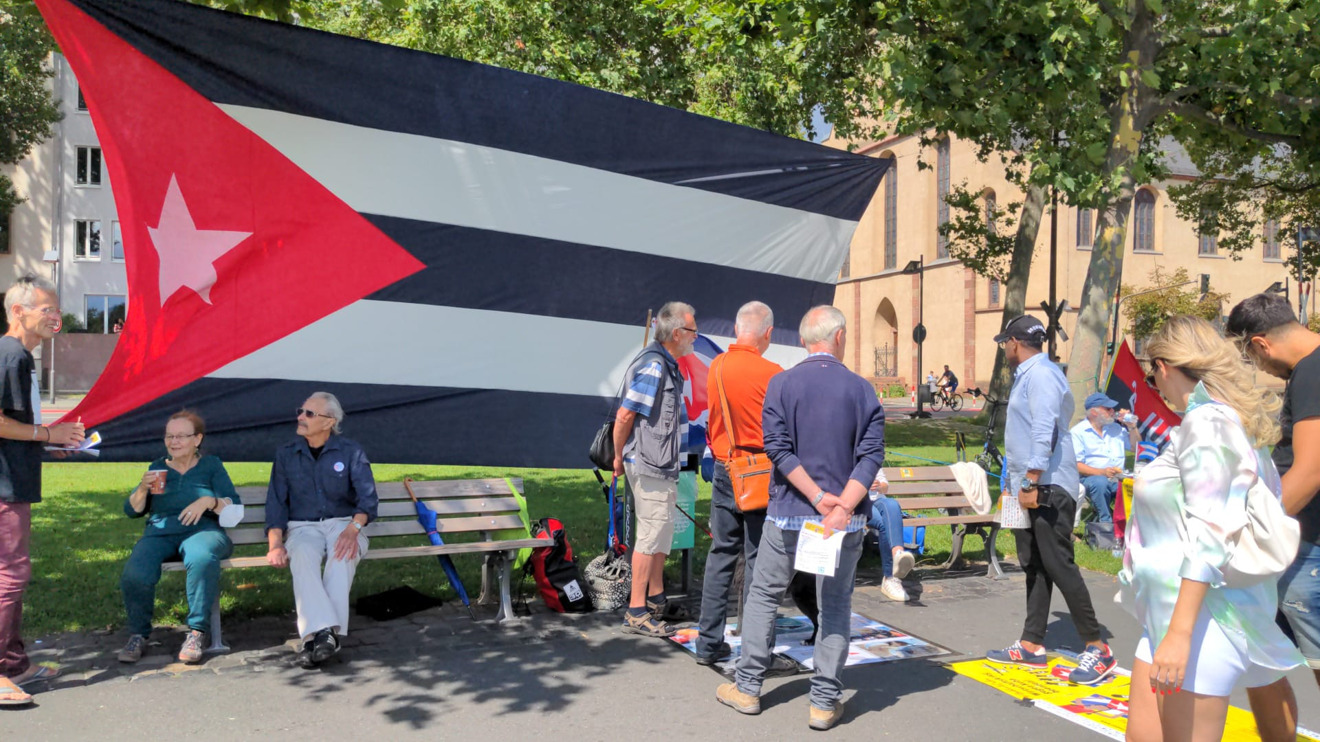 Kundgebung in Düsseldorf auf dem Bertha-von-Suttner-Platz für das Ende der US-Blockade gegen Cuba am 30.10.23, unweit vom US-Konsulat.
