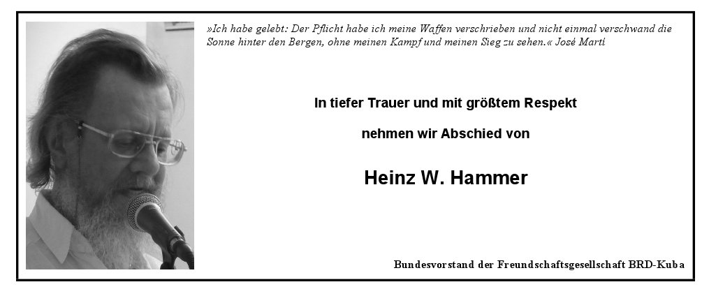 Wir möchten an einen Mann erinnern und ihm Tribut zollen, dessen Vermächtnis in unseren Herzen und Gedanken unsterblich bleibt: Fidel Castro, unser Comandante en Jéfe. Der letzte große Führer des 20. Jahrhunderts; der Einzige, der den Erfolg seines eigenen Werkes überlebte: die Kubanische Revolution.